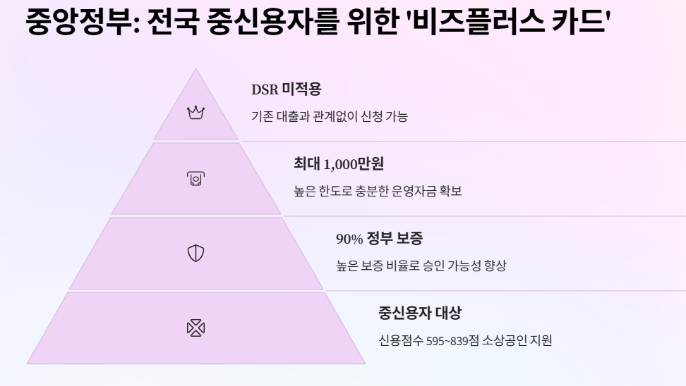 주요 특징: 정부가 추진하는 '비즈플러스 카드'는 전국 소상공인을 대상으로 하며, 특히 DSR(총부채원리금상환비율) 규제를 적용받지 않는다는 점이 핵심입니다. 이로 인해 기존 대출이 많아 추가 대출이 어려웠던 중신용 소상공인에게 새로운 기회가 될 수 있습니다.