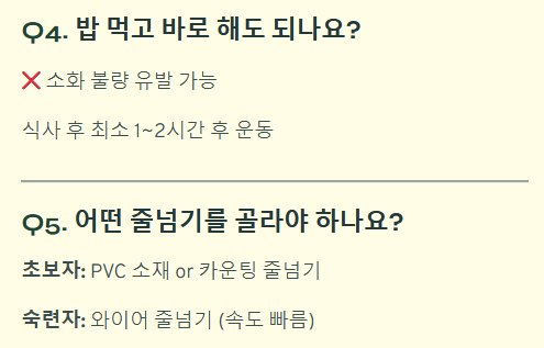 Q4. 밥 먹고 바로 해도 되나요? 위장이 출렁거려 소화 불량을 일으킬 수 있습니다. 식사 후 최소 1~2시간이 지난 뒤, 소화가 충분히 된 상태에서 운동하는 것이 좋습니다.