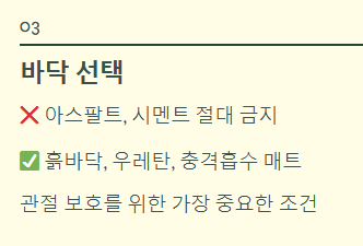 - 바닥 선택: 아스팔트나 시멘트 바닥은 절대 피하세요. 흙바닥, 우레탄 바닥, 혹은 충격을 흡수해주는 전용 매트 위에서 뛰는 것이 관절을 보호하는 가장 중요한 조건입니다.