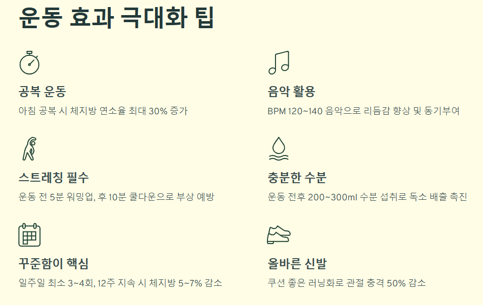 | 달리기 | 시속 9~10km | 약 300~350 kcal | 전신 유산소 |