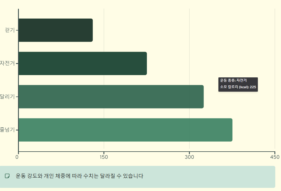 운동 강도와 개인의 체중에 따라 수치는 달라질 수 있습니다.