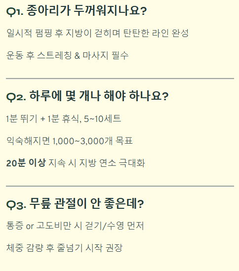 Q1. 줄넘기하면 종아리가 두꺼워지나요? 많은 여성분들이 걱정하는 부분입니다. 운동 직후에는 근육이 펌핑되어 일시적으로 커 보일 수 있지만, 꾸준히 하면 지방이 걷히면서 오히려 다리 라인이 탄탄하고 매끈해집니다. 운동 후 종아리 스트레칭과 마사지를 꼼꼼히 해주시면 예쁜 라인을 만드는 데 도움이 됩니다.