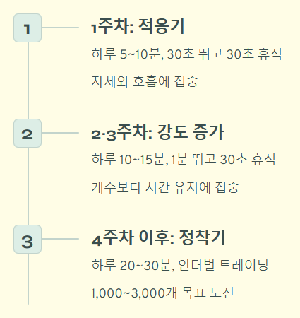 Q2. 하루에 몇 개나 해야 살이 빠지나요? 개수보다는 시간과 강도가 중요합니다. 처음에는 개수에 집착하기보다 1분 뛰고 1분 휴식을 5~10세트 반복하는 인터벌 방식을 추천합니다. 익숙해지면 하루 1,000개에서 3,000개 정도를 목표로 하되, 20분 이상 지속해야 지방 연소 효과가 극대화됩니다.