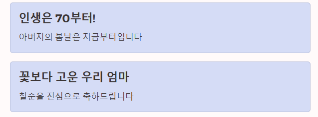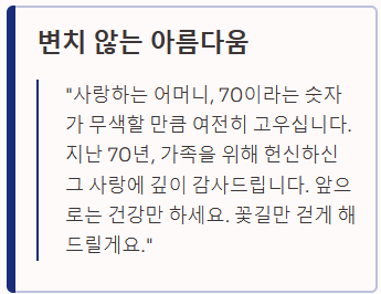 - "사랑하는 어머니, 70이라는 숫자가 무색할 만큼 여전히 고우십니다. 지난 70년, 가족을 위해 헌신하신 그 사랑에 깊이 감사드립니다. 앞으로는 건강만 하세요. 꽃길만 걷게 해 드릴게요."