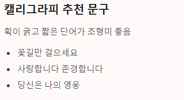 "꽃길만 걸으세요", "사랑합니다 존경합니다", "당신은 나의 영웅"처럼 획이 굵고 짧은 단어 위주의 문장이 캘리그라피로 썼을 때 조형미가 좋습니다.