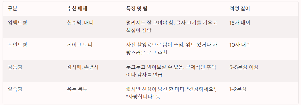 문구는 어디에 쓰느냐에 따라 길이와 톤이 달라져야 합니다. 현수막이나 케이크에는 짧고 강렬하게, 편지에는 진심을 담아 길게 작성하는 것이 좋습니다.