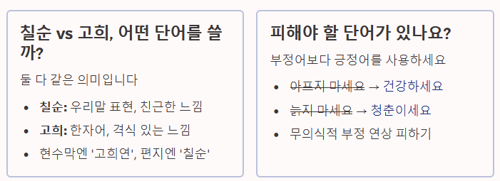 부모님의 칠순(고희)이 다가오면 자녀들은 선물이나 식당 예약뿐만 아니라 마음을 전할 '문구' 때문에 깊은 고민에 빠지곤 합니다. 평소 "사랑합니다", "감사합니다"라는 말을 자주 하지 못했다면, 이번 칠순을 기회 삼아 진심이 담긴 메시지를 전하는 것이 무엇보다 중요합니다.