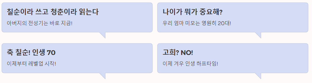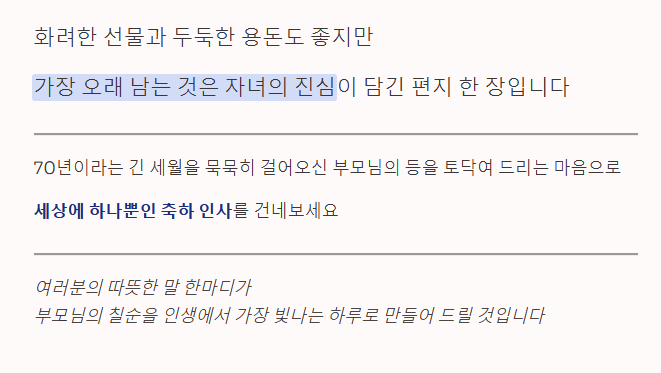 여러분의 따뜻한 말 한마디가 부모님의 칠순을 인생에서 가장 빛나는 하루로 만들어 드릴 것입니다.