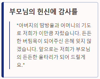 "키워주셔서 감사합니다"보다 더 구체적인 에피소드를 한 줄 추가하면 감동이 배가됩니다.