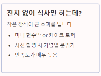 최근에는 잔치 대신 가족 식사만 하는 경우가 많습니다. 하지만 식사 자리에 작은 '미니 현수막'이나 '케이크 토퍼' 하나만 준비해도 사진을 남길 때 기념일 분위기를 낼 수 있어 만족도가 매우 높습니다.