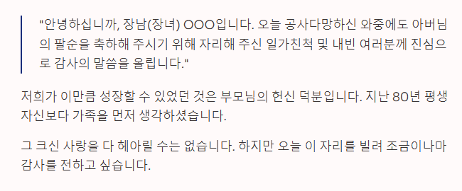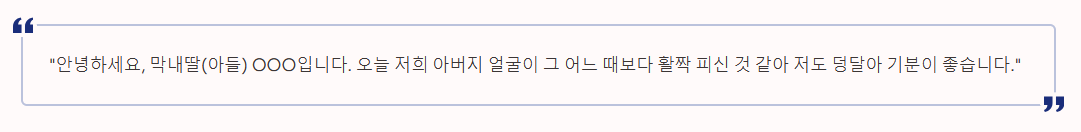 "안녕하세요, 막내딸(아들) OOO입니다. 오늘 저희 아버지(어머니) 얼굴이 그 어느 때보다 활짝 피신 것 같아 저도 덩달아 기분이 좋습니다. 와주신 분들 모두 정말 감사합니다.