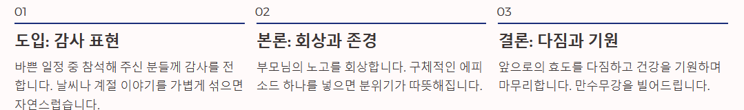 - 구성: [하객 감사] - [부모님 고생과 은혜 회상] - [현재의 감사] - [건강 기원] 순서가 정석입니다.