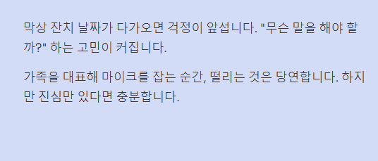 | 스피치 팁 | - 천천히 말하기: 긴장하면 말이 빨라집니다. 의식적으로 한 템포 쉬어가세요. - 시선 처리: 원고만 보지 말고, 가끔 부모님과 하객을 번갈아 봐주세요. - 울컥할 때: 잠시 멈추고 물을 한 모금 마시거나 심호흡을 해도 괜찮습니다. 오히려 감동적입니다. |