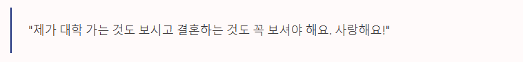 앞으로 공부도 열심히 하고 부모님 말씀도 잘 듣는 착한 손자가 되겠습니다. 아프지 마시고 오래오래 건강하셔서 저 대학 가는 것도 보시고 결혼하는 것도 꼭 보셔야 해요. 사랑해요!"
