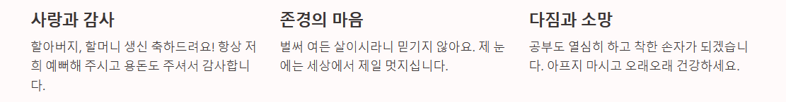 아버지(어머니), 그동안 정말 고생 많으셨습니다. 그리고 감사합니다. 저희 자식들, 부모님께서 보여주신 사랑 본받아 우애 있게 잘 살겠습니다. 부디 지금처럼 건강한 모습으로 저희 곁에 오랫동안 머물러 주십시오. 사랑합니다."