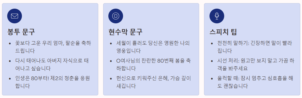 - 거창한 마이크가 없더라도, 가족끼리 식사하기 전 케이크 촛불을 끄고 나서 자녀 대표가 짧게 감사 인사를 전하는 시간은 꼭 갖는 것이 좋습니다. 그 순간이 부모님께는 가장 큰 선물입니다.