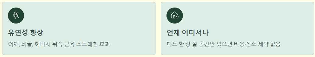 - 비용과 장소 제약 없음: 매트 한 장 깔 공간만 있으면 언제 어디서든 가능합니다.