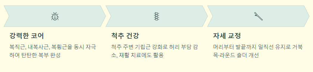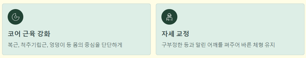 - 코어 근육 강화: 복근, 척추기립근, 엉덩이 등 몸의 중심 근육을 단단하게 만듭니다.