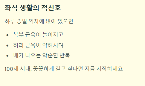 현대인의 가장 큰 적은 좌식 생활입니다. 하루 종일 의자에 앉아 있다 보면 복부 근육은 늘어지고 허리 근육은 약해져 배가 나오고 허리가 아픈 악순환이 반복됩니다.