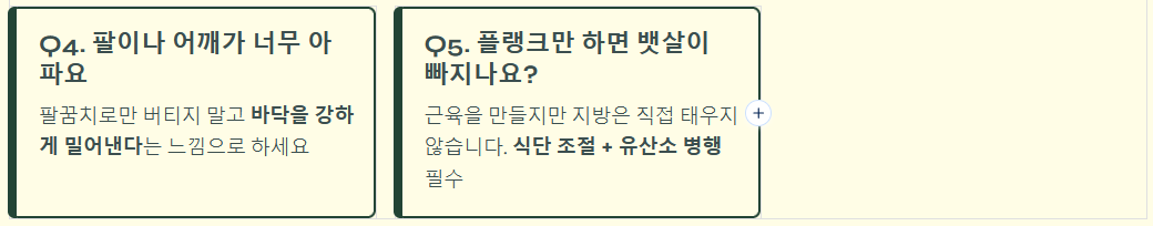 - 참고: 플랭크는 칼로리 소모 자체가 목적인 유산소 운동이라기보다, 근육을 만들어 기초대사량을 높이는 몸매 관리 운동에 가깝습니다.