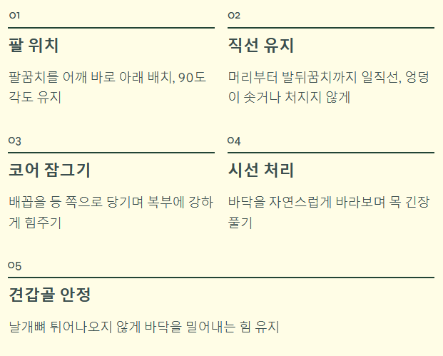 - 팔 위치: 엎드린 상태에서 팔꿈치를 어깨 바로 아래에 위치시킵니다. (팔꿈치 각도 90도 유지)