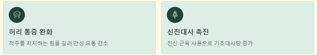 - 허리 통증 완화: 척추를 지지하는 힘을 길러 만성적인 요통을 줄여줍니다.
