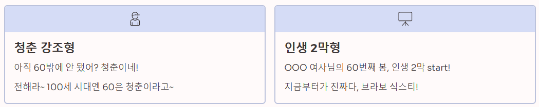 | 청춘 강조형 | 아직 60밖에 안 됐어? 청춘이네! / 전해라~ 100세 시대엔 60은 청춘이라고~ | 유행어 활용 |