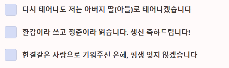 - 오래오래 건강하세요. 이제는 저희가 효도할 차례입니다.