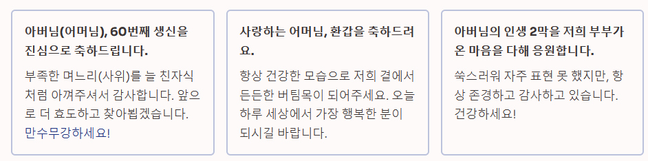 - "아버님(어머님), 60번째 생신을 진심으로 축하드립니다. 부족한 며느리(사위)를 늘 친자식처럼 아껴주셔서 감사합니다. 앞으로 더 효도하고 찾아뵙겠습니다. 만수무강하세요!"