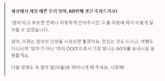 엄마, 이제는 엄마의 인생을 사셨으면 좋겠어요. 맛있는 것도 드시고, 여행도 다니시며 '엄마'가 아닌 '여자 OOO'으로서 가장 빛나는 60대를 보내시길 응원할게요. 다음 생에도 꼭 엄마 딸(아들)로 태어나게 해 주세요. 사랑해!"