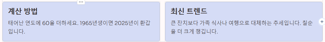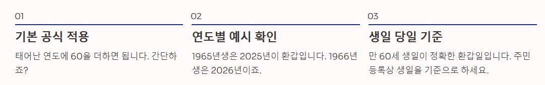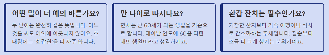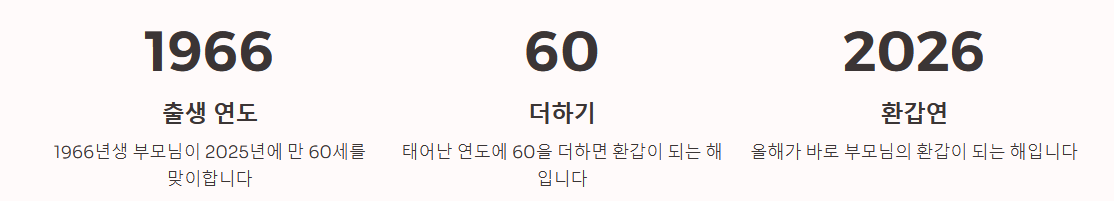 - 계산 방법: 태어난 연도에 60을 더하면 회갑연이 되는 해가 됩니다. (예: 1965년생 → 2025년이 환갑)