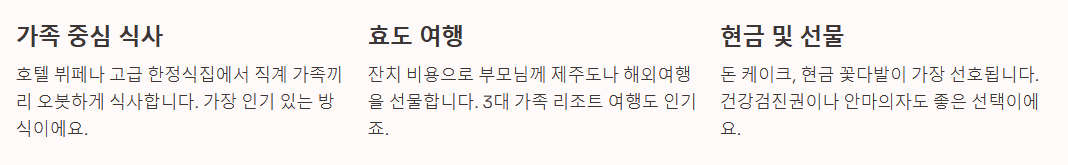 잔치 비용을 여행 경비로 전환하여 부모님을 해외여행이나 제주도 여행을 보내드리는 것이 인기입니다. 혹은 3대 가족이 함께 리조트로 여행을 떠나기도 합니다.