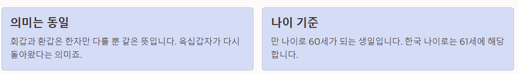 - 나이 기준: 한국 나이(세는 나이)로 61세, 만 나이로 60세가 되는 생일을 말합니다.
