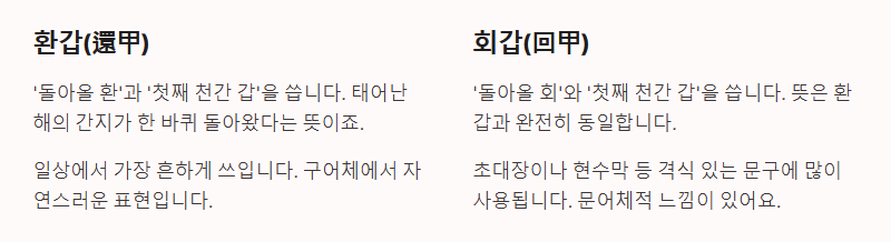 - 의미의 동일성: 회갑(回甲)과 환갑(還甲)은 한자만 다를 뿐, '육십갑자가 다시 돌아왔다'는 뜻으로 완전히 같은 말입니다.