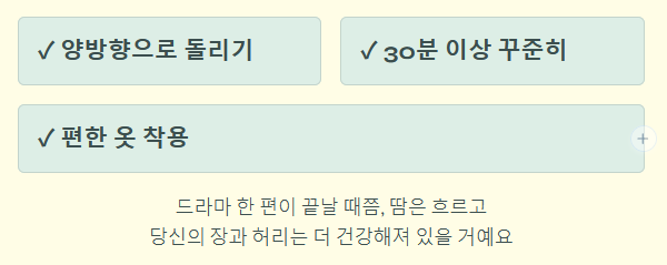 | 훌라후프 | 중강도 | 약 150~200 kcal | 복부 및 코어 집중 |