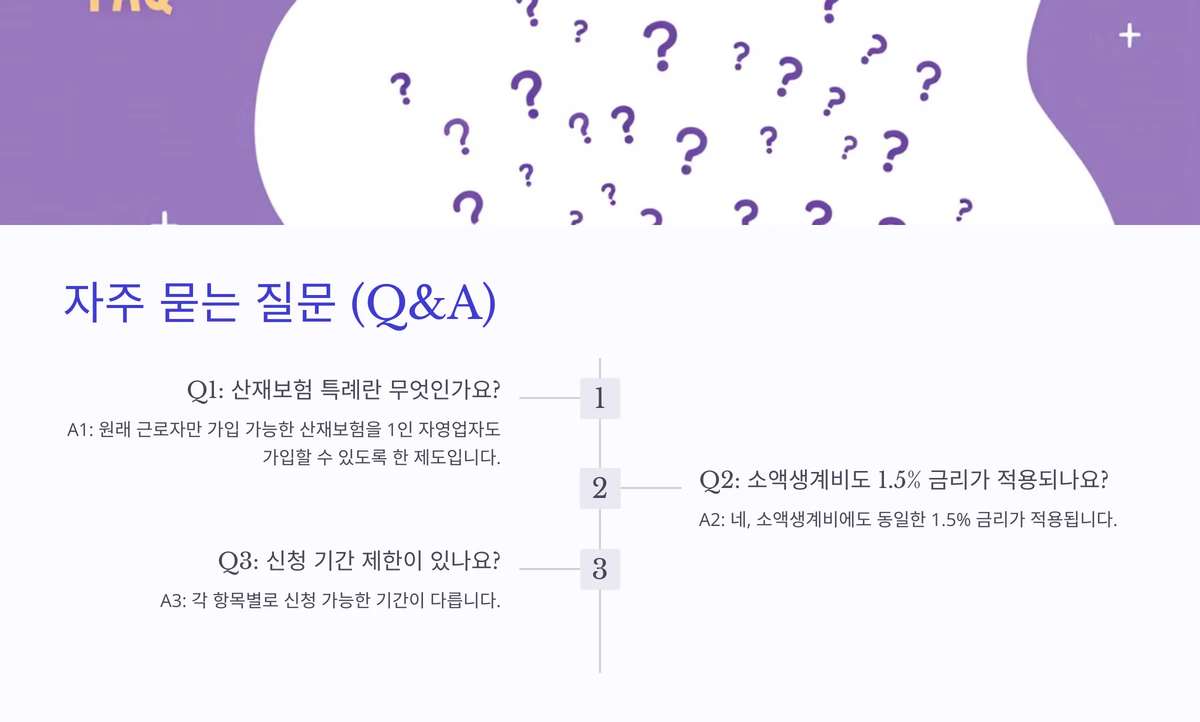 - A1: 원래 근로자만 가입 가능한 산재보험을 1인 자영업자도 가입할 수 있도록 한 제도입니다. 가입 후 3개월 이상 유지해야 융자 신청이 가능합니다.