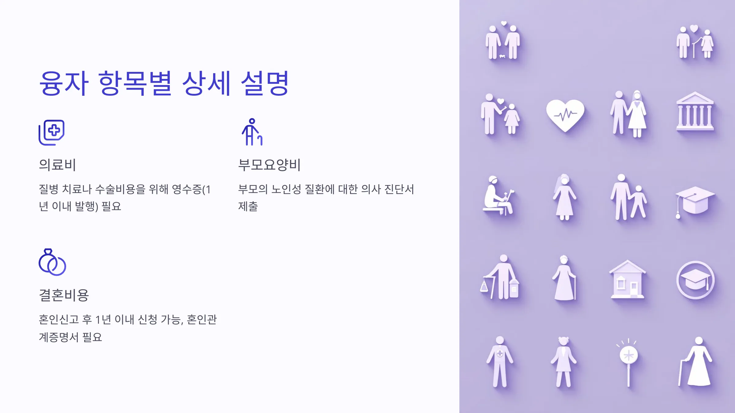 - 의료비, 부모요양비, 장례비: 최대 1,000만 원