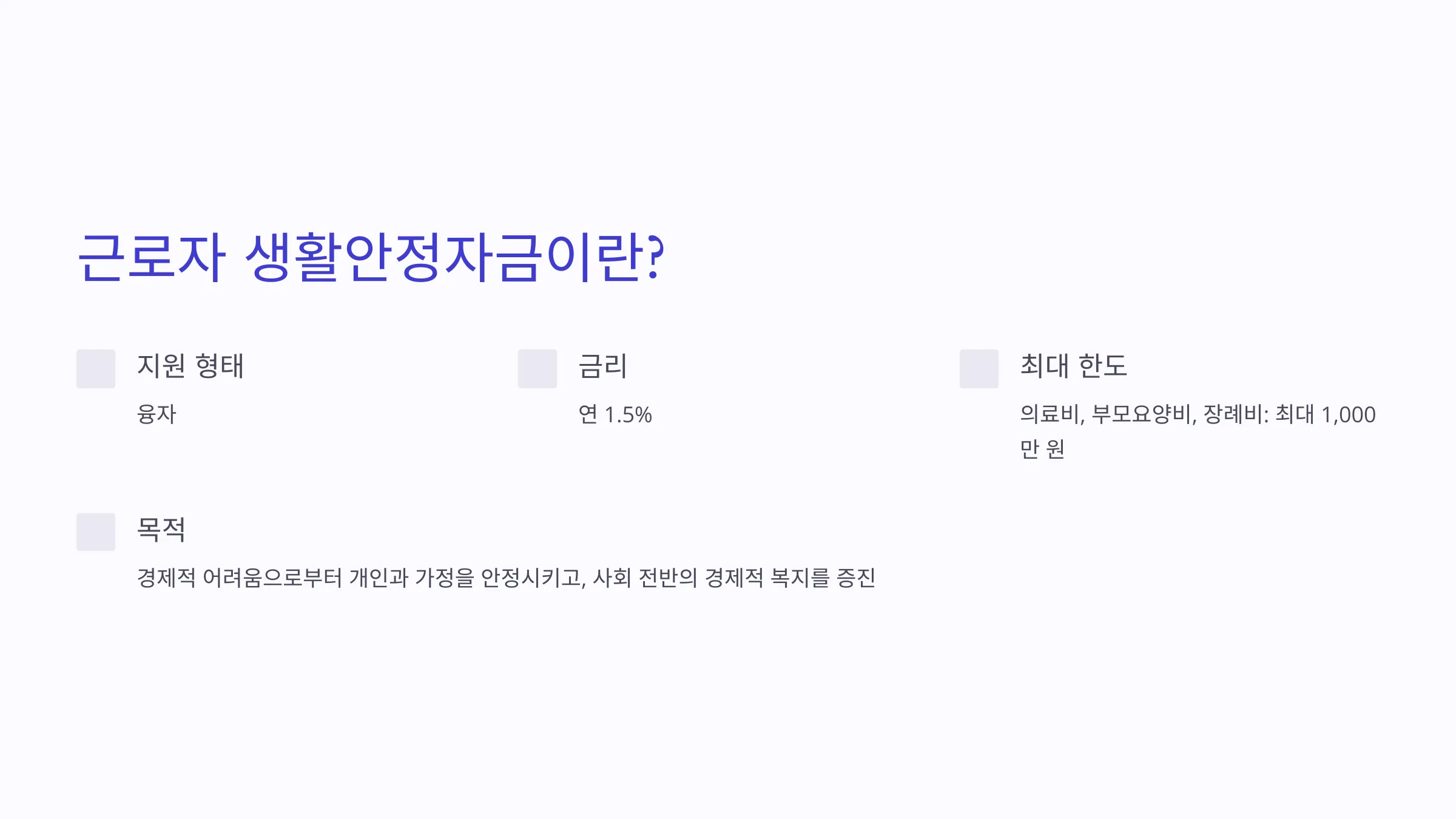 근로자 생활안정자금은 저소득 근로자 및 1인 자영업자들이 의료비, 부모요양비, 장례비, 결혼비용, 자녀 학자금 등 생활 필수 비용을 저리로 융자받을 수 있는 정부 정책 자금입니다. 이 제도는 경제적 어려움으로부터 개인과 가정을 안정시키고, 사회 전반의 경제적 복지를 증진하는 것을 목표로 하고 있습니다. 주요 내용은 다음과 같습니다: