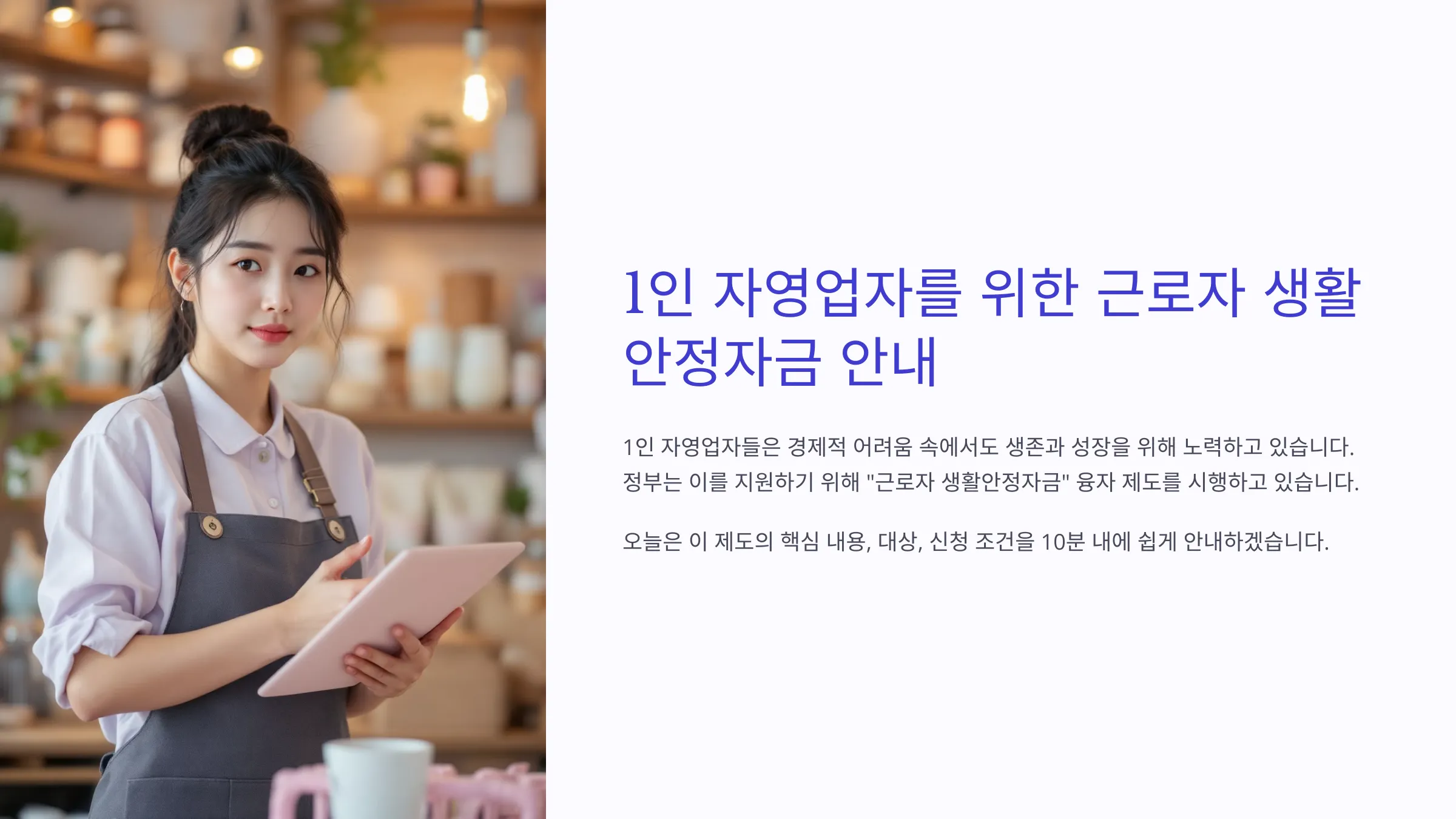1인 자영업자들은 치솟는 물가와 줄어드는 소비로 인해 경제적 어려움을 겪으면서도 생존과 성장을 위해 끊임없이 노력하고 있습니다. 예를 들어, 소규모 음식점을 운영하는 자영업자는 재료비와 임대료 상승에도 불구하고 고객 유치를 위해 창의적인 메뉴와 프로모션을 도입하는 등 다양한 방안을 모색하고 있습니다. 이를 지원하기 위해 정부는 저소득 근로자와 1인 자영업자를 대상으로 한 "근로자 생활안정자금" 융자 제도를 시행하고 있습니다. 오늘은 이 제도의 핵심 내용, 대상, 신청 조건을 10분 내에 쉽게 이해할 수 있도록 안내하겠습니다.