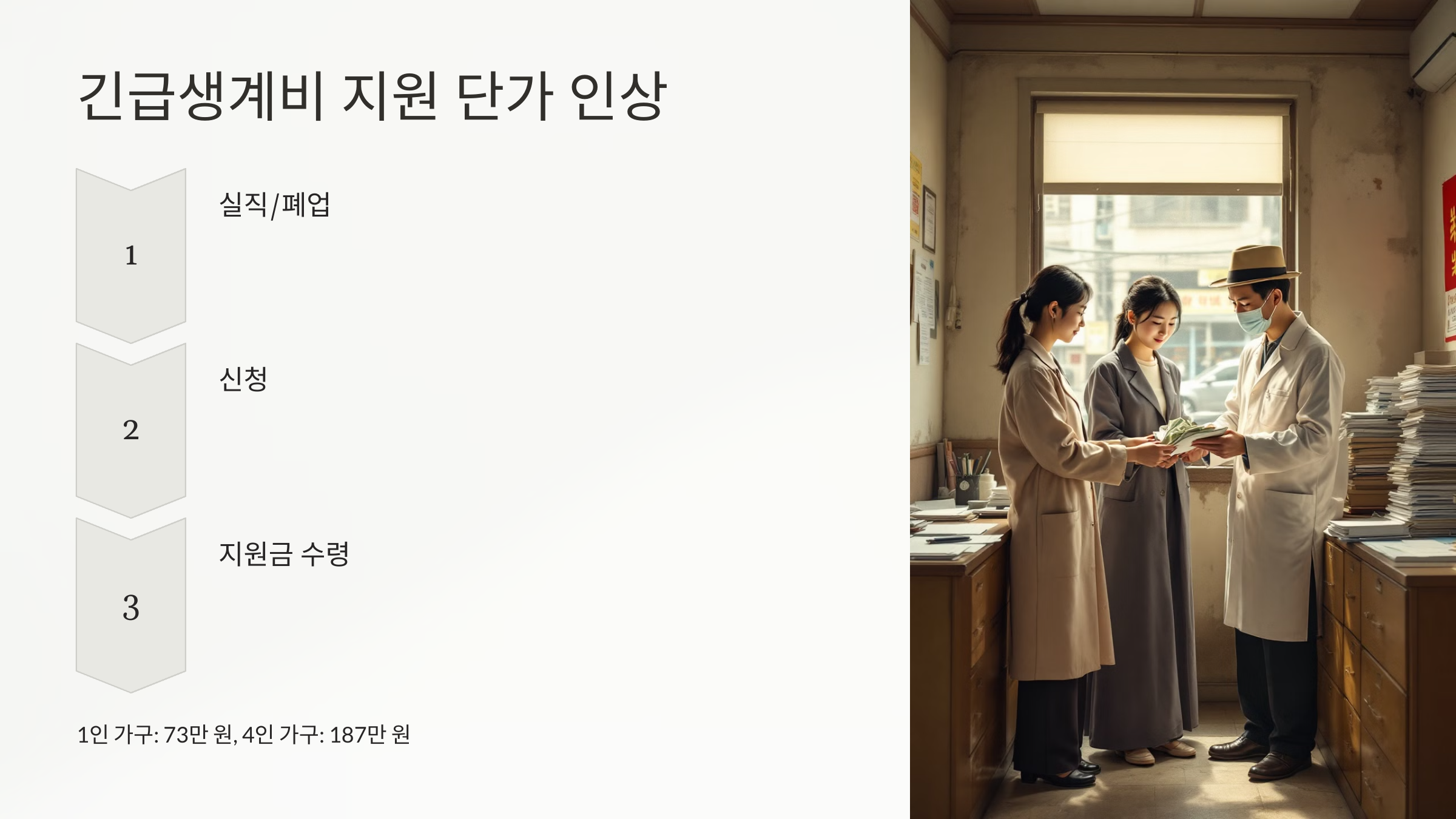- 지원 금액: 1인 가구 기준 73만 원, 4인 가구 187만 원 등으로 조정되었습니다.