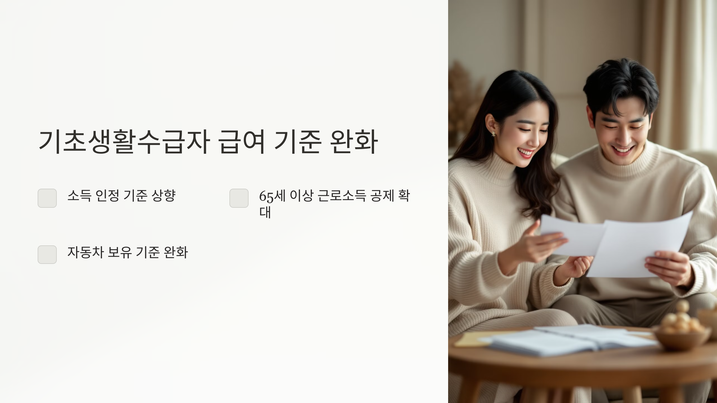 기초생활수급자의 소득 인정 기준이 크게 완화됩니다. 이는 복지제도의 문턱을 낮추고 지원 대상자를 확대하려는 의도입니다.