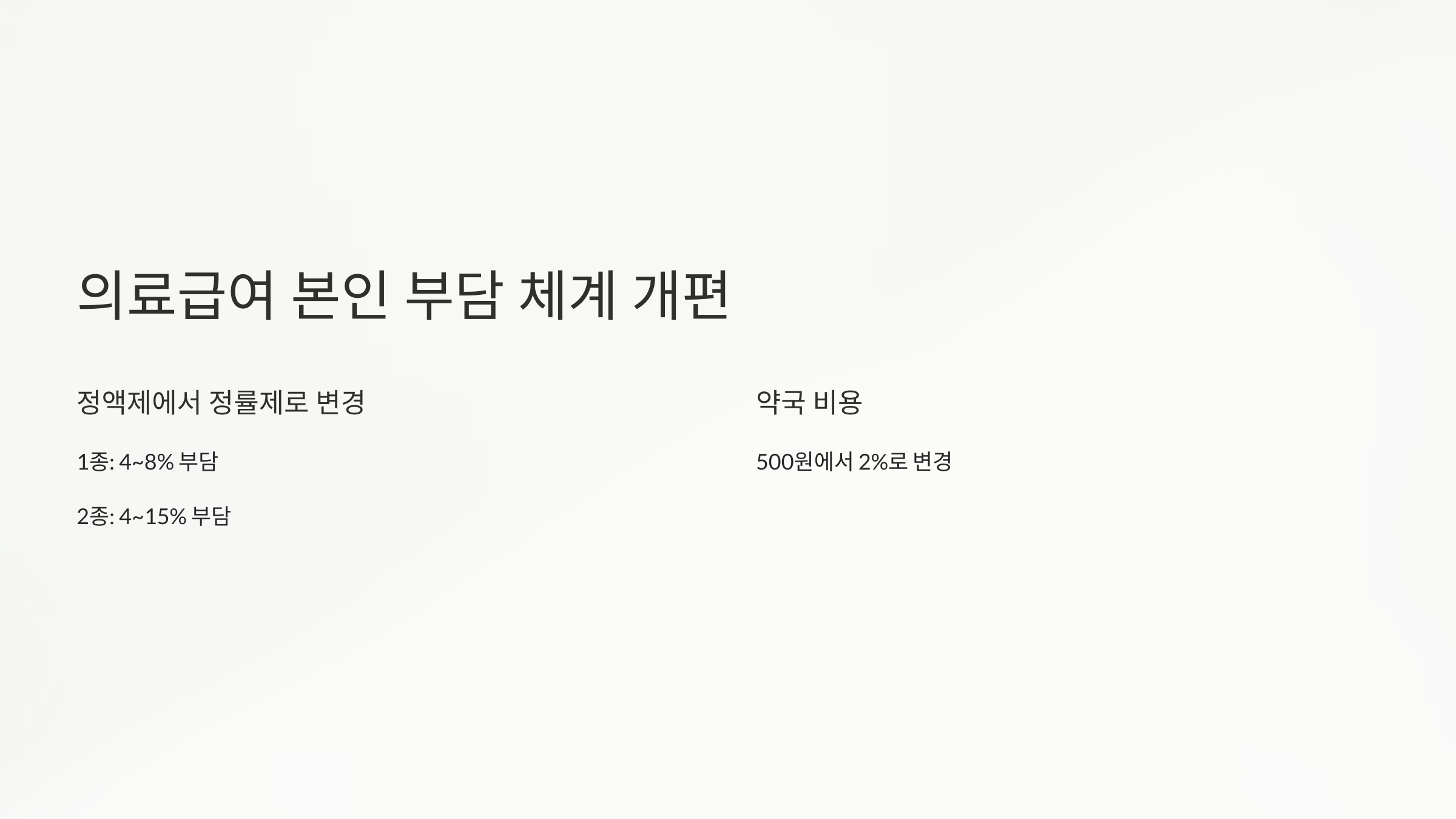 - 정률제 도입의 의미: 정률제는 진료비의 일정 비율을 본인이 부담하는 방식으로, 사용자 부담이 소득 수준에 비례해 결정됩니다.