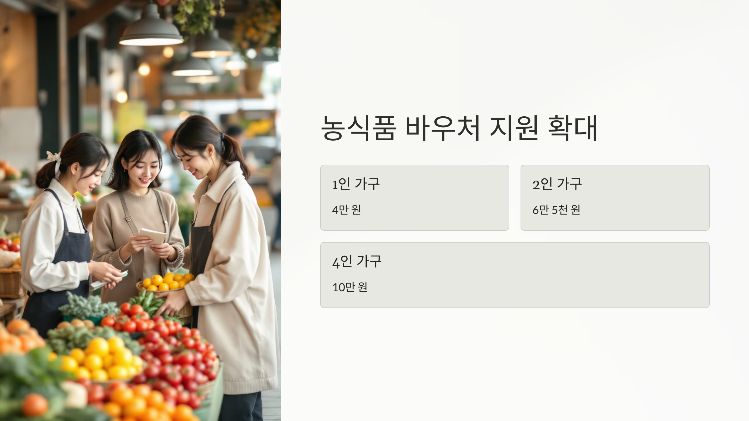 생계급여 수급 가구를 대상으로 신선 농산물 구매를 지원하는 농식품 바우처가 시행됩니다.