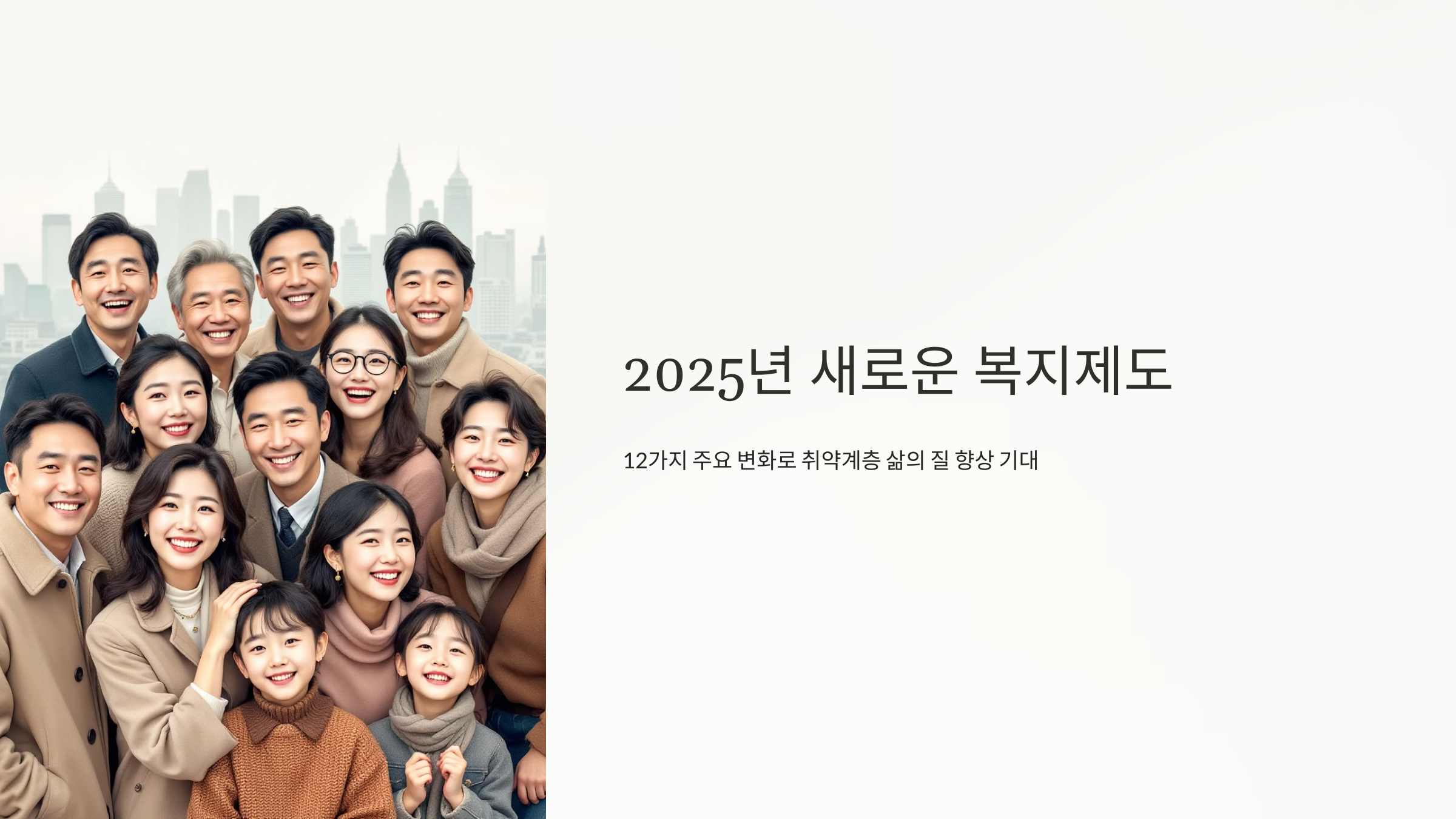 2025년을 맞이하며 우리 사회의 복지 시스템이 어떻게 발전하고 변화할지 살펴보겠습니다. 이번 개편은 다양한 사회 계층의 필요를 충족시키고, 사회적 안전망을 강화하기 위해 설계되었습니다. 주요 복지제도 변화 12가지를 분석하며, 각각의 영향과 배경을 상세히 설명하겠습니다.