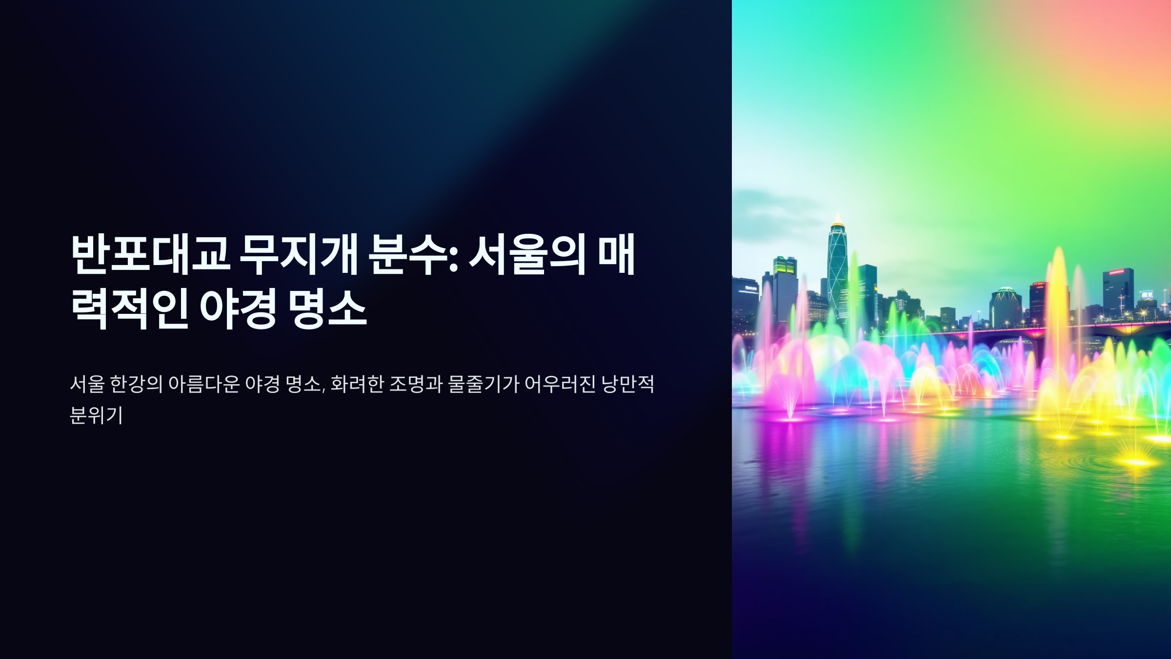 서울의 한강을 가로지르는 반포대교는 단순한 교량을 넘어, 아름다운 야경과 함께 시민들에게 특별한 볼거리를 제공하는 명소로 자리 잡고 있습니다. 특히 반포대교의 무지개 분수는 화려한 조명과 물줄기가 어우러져 낭만적인 분위기를 연출하며, 많은 이들에게 사랑받는 장소입니다. 이 글에서는 반포대교 무지개 분수의 매력을 자세히 알아보고, 방문 시 유용한 정보를 학습자가 쉽게 이해할 수 있도록 정리해 보겠습니다.