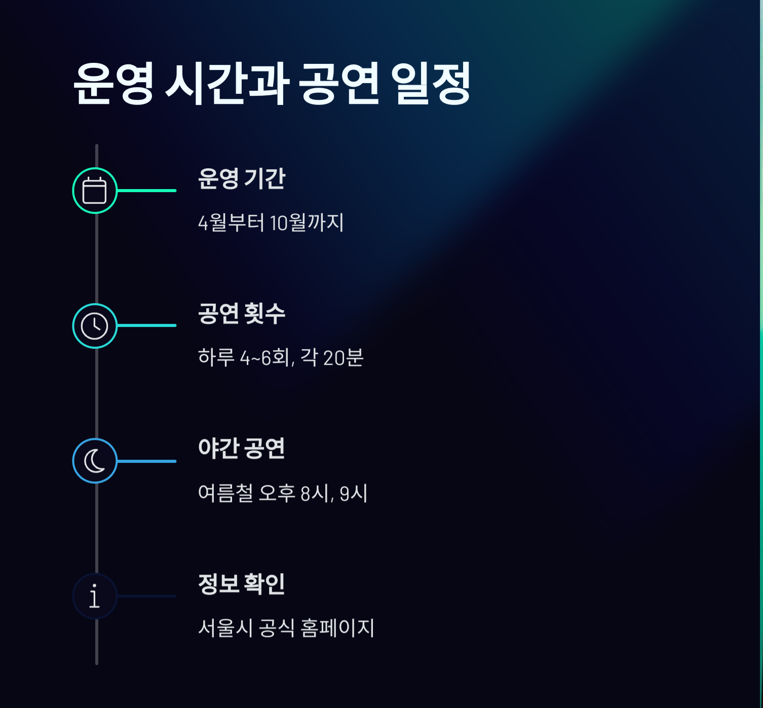 예를 들어, 여름철에는 오후 8시와 9시에 야간 공연이 진행되며, 계절에 따라 시간이 조정될 수 있으니 방문 전 서울시 공식 홈페이지에서 정확한 일정을 확인하는 것이 좋습니다. - 음악과 조명의 조화