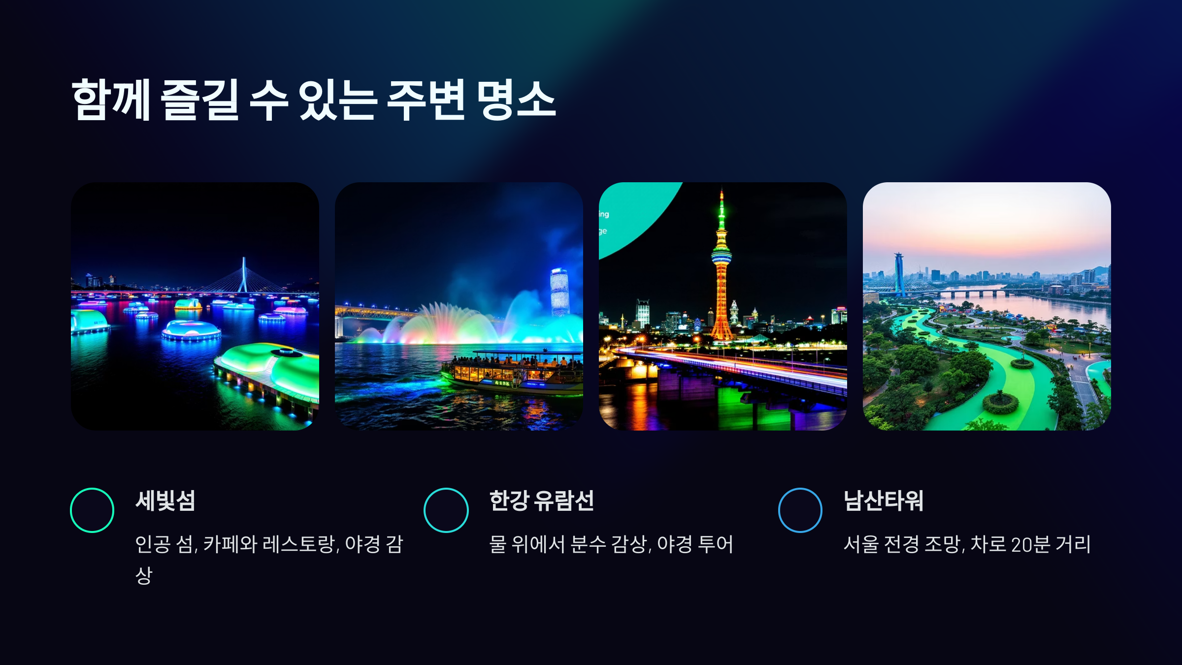 반포대교 근처에 위치한 세빛섬은 인공 섬으로, 낮에는 카페와 레스토랑에서 여유로운 시간을 보낼 수 있고, 밤에는 화려한 조명으로 물든 야경을 감상할 수 있습니다. 세빛섬에서 바라보는 무지개 분수의 모습도 색다른 매력을 느낄 수 있습니다. - 한강 유람선