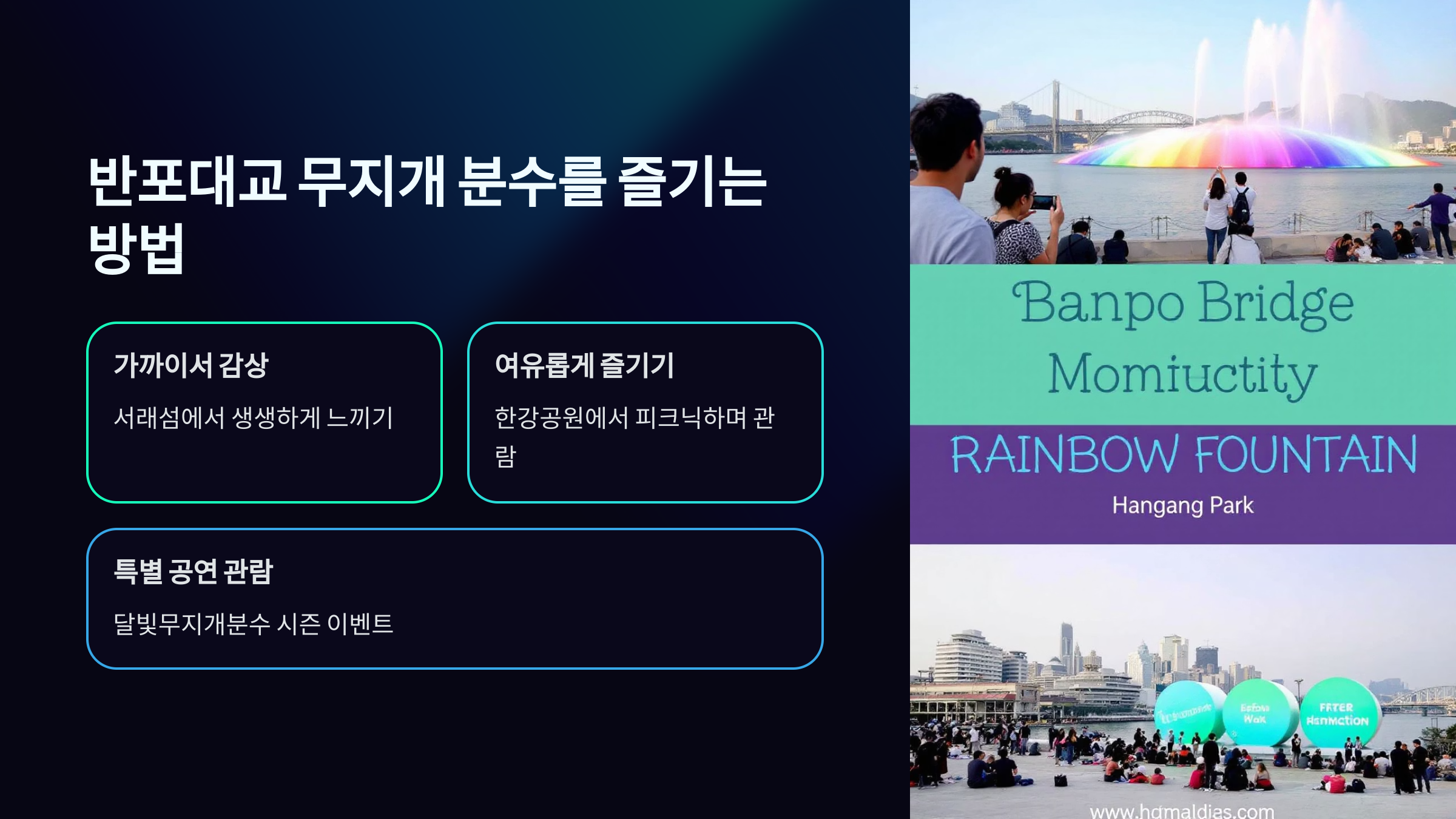 한 방문객은 “반포대교 무지개 분수를 처음 봤을 때, 마치 물이 음악에 맞춰 춤을 추는 것 같아 감탄이 절로 나왔다”고 후기를 남기기도 했습니다.