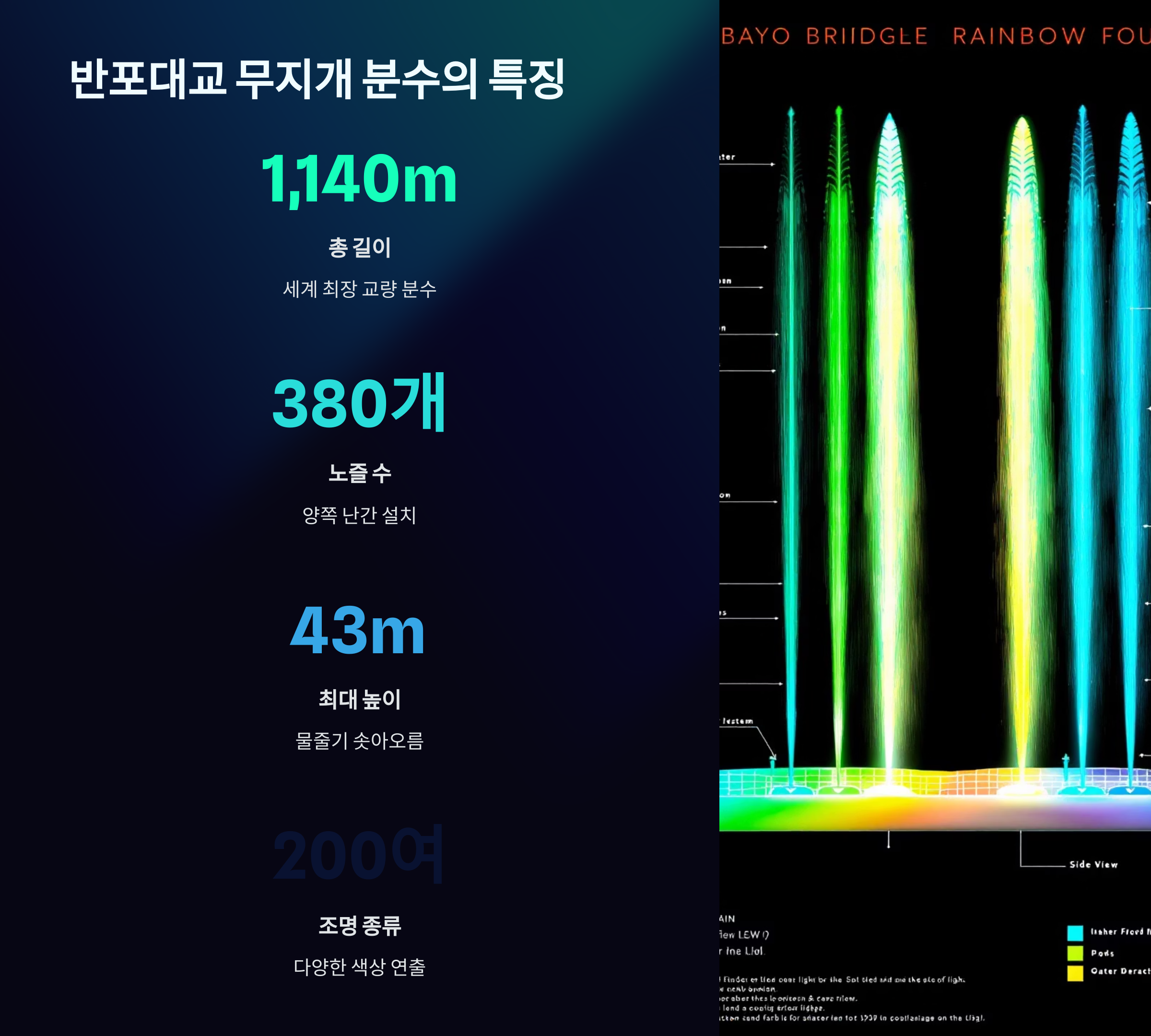 반포대교 무지개 분수는 세계에서 가장 긴 교량 분수로 기네스북에 등재된 기록을 가지고 있습니다. 이 분수는 반포대교의 양쪽 난간에 설치된 380개의 노즐에서 물을 뿜어내며, 총 길이 1,140미터에 달합니다. 물줄기는 최대 43미터 높이까지 솟아오르며, 200여 가지의 조명과 음악이 어우러져 화려한 공연을 선사합니다.