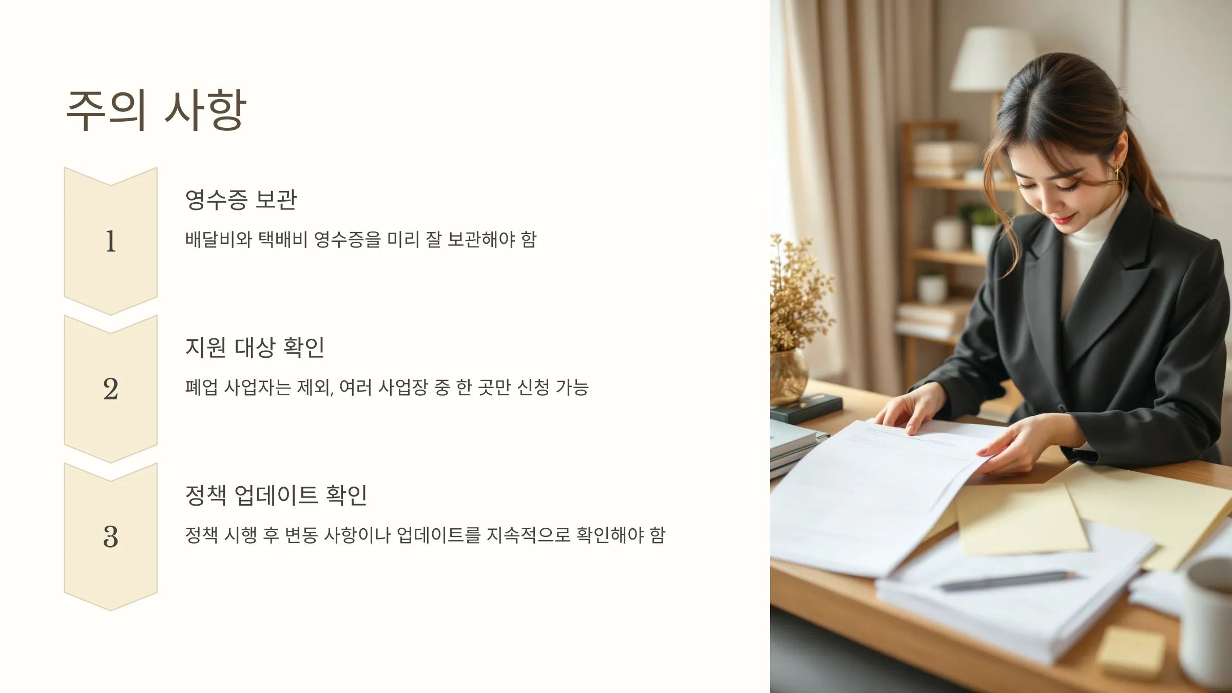 - 배달비와 택배비 영수증을 미리 잘 보관해 두어야 합니다. 이 자료는 지원금 신청의 핵심 요건이므로, 실수로 분실하지 않도록 주의해야 합니다.